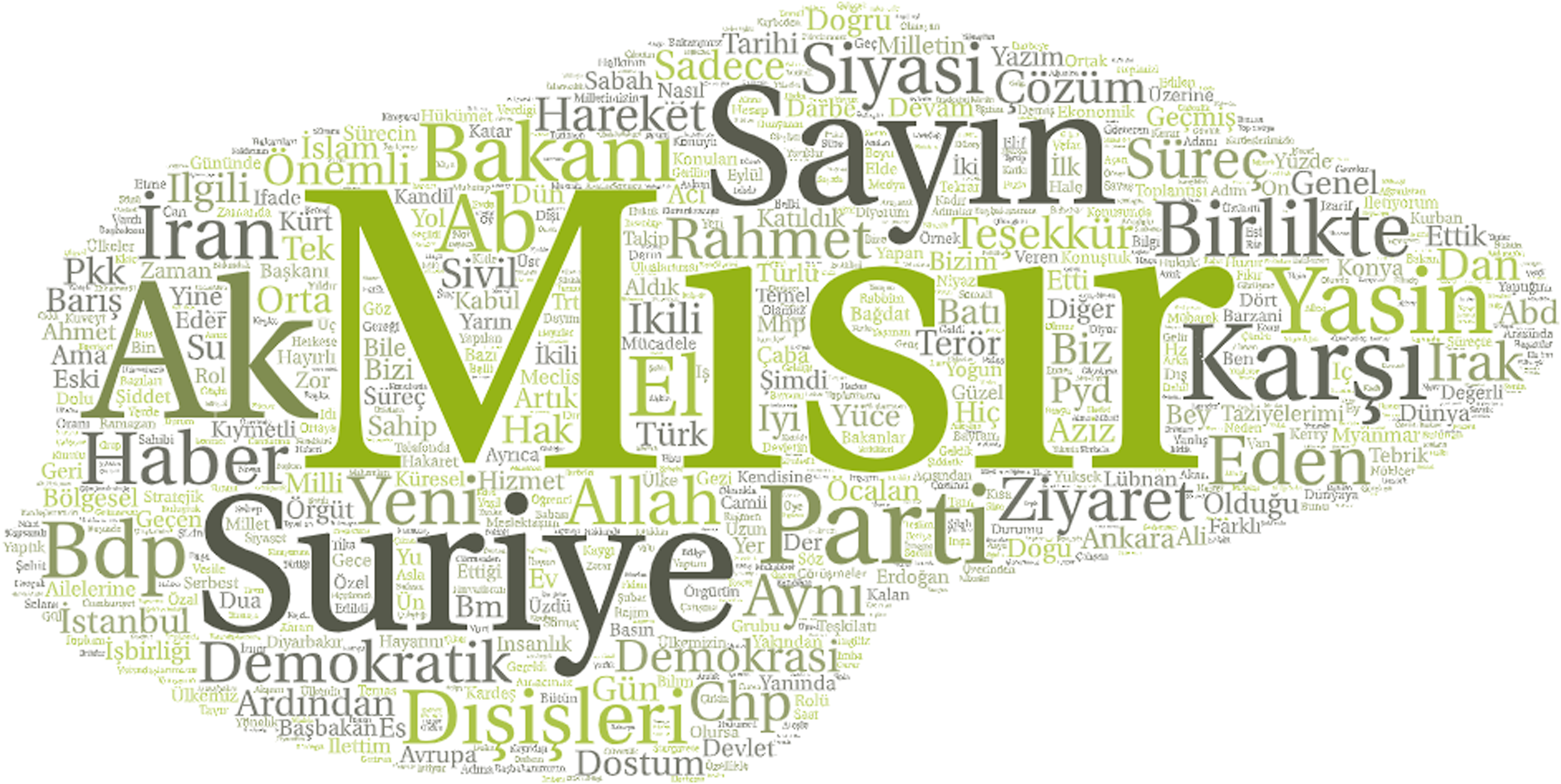 The exclusive nature of being a citizen in the AKP’s Turkey persisted in 2013, evidenced by the use of “us” (biz) the most (see Figures 4 and 5), which was followed by the “nation” (millet), “ours” (bizim), and “AK Party.” Different from his online political speech in 2012, Erdoğan’s political speech revolved around an additional “Syria” (Suriye) in 2013, which is even more evident in tweets of the other three main actors of AKP at the time. Egypt is the most used word in the political speech of these actors in 2013, followed by Syria (see Figure 5). As the tweets of these actors in this period show, Turkey increasingly aimed at becoming the hegemonic power in the Middle East.