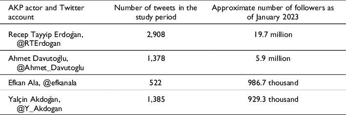 Our analysis concentrates on the populist online political speech of Recep Tayyip Erdoğan, Ahmet Davutoğlu, Yalçın Akdoğan, and Efkan Ala. The main reason why we focus on the profile data of the AKP government’s main actors but not the official or institutional (e.g. Presidency or Prime Ministry) Twitter accounts of the AKP is because of the personality cult around Erdoğan, which is not only related to the wider regime that combines elements of electoral authoritarianism, neopatrimonialism, Islamism, and populism (Yılmaz and Bashirov 2018), but also Erdoğan’s one-man rule within the AKP. Today, right-wing populist and far-right “celebrity” politicians are instigators of social, political, and economic forces, rather than being just reflections of them (Zeglen and Ewen Reference Zeglen and Ewen2020, 271–272). Erdoğan has been, and continues to be, the perceived oracle on the key political issues that determine the future of Turkey, the Kurdish question being one of these. Along with Erdoğan’s Twitter communication, other actors such as Davutoğlu, Akdoğan, and Ala were the “appointed” agents of the peace process, determined by Erdoğan himself. Therefore, instead of looking at the institutional accounts, we focus on these four key actors and their “personal” online communication rhetoric and patterns throughout the peace process.