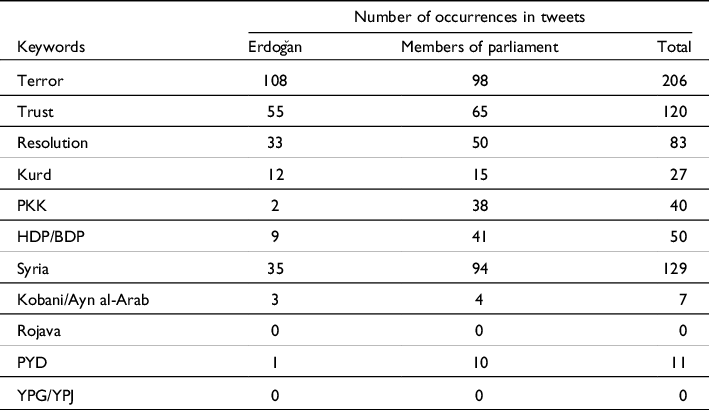 Our attention in the microanalysis shifted from a populist discourse around “us” to the polarizing discourse that aimed to identify “them.” In a deductive approach, we identified and searched for certain keywords relevant to the peace process, including different actors of the Kurdish movement in Turkey and Syria (see Table 2). In doing this, we aimed to expand on the “rationalities” on which politics is based (Finlayson Reference Finlayson2007) and explore how the AKP’s most important actors framed the peace process domestically, while depicting the Rojava experience in Syria.