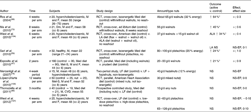 M, male; F, female; RCT, randomised controlled trial; Med diet, Mediterranean diet; ↑ , increase; +, significant increase in endothelial function; Dm, type 2 diabetes mellitus; LA, linoleic acid; ALA, α-linolenic acid; NS, not significant; NS-EF, no significant change in endothelial function; Met-S, metabolic syndrome; LF, low-fat.