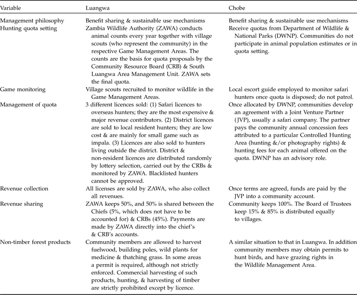 Historically, Zambia is a former colony and Botswana a former protectorate of Britain. During the colonial period natural resources were managed by central Government agencies in national parks and game reserves, and these methods constrained access by adjacent communities. After independence this approach continued to prevail. Illegal and unsustainable resource use followed and national wildlife authorities were overwhelmed. To meet the challenge, Zambia and Botswana developed similar policy and legislation regarding community inclusion to improve management, conservation and sustainable use of natural resources, particularly wildlife. New institutions were created to implement CBNRM in park buffer areas, namely Community Resource Boards in Zambia and Community Trusts in Botswana. Today, Zambia’s protected areas cover c. 30% of the country’s total land area, comprising 19 National Parks and 34 Game Management Areas (GRZ, undated). Botswana’s Protected Areas cover 18% of the country’s total land area, with an additional 24% designated as Wildlife Management Areas; the latter are further subdivided into Controlled Hunting Areas (Rozemeijer, Reference Rozemeijer2003). In both countries the Government wildlife authority is the main facilitator of CBNRM activities, providing advice and guidance, but also with decision-making authority (Table 1).