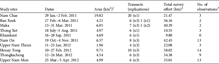 Table 1 Study sites visited in Nakai–Nam Theun National Protected Area (Fig. 1) during 2011–2012, with the area covered, the total number of transects, the total survey effort, and the number of observations at each site.