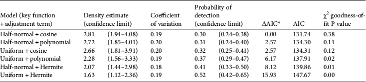 Table 2 Distance analysis results for different models, calculated with 55 observations and data grouping with five intervals (cut-off points: 0, 20, 40, 60, 80, 104 m), with density estimate, coefficient of variation, probability of detection, ΔAIC, AIC, and χ2 goodness-of-fit P value.