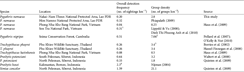 Table 4 Comparison of estimates of colobine density in South-east Asia, with species, location, overall detection frequency, group density, and source. Note that methodologies differ between studies, which can lead to violation of some of the assumptions of the distance sampling method (refer to the specific studies for details of methodologies).
