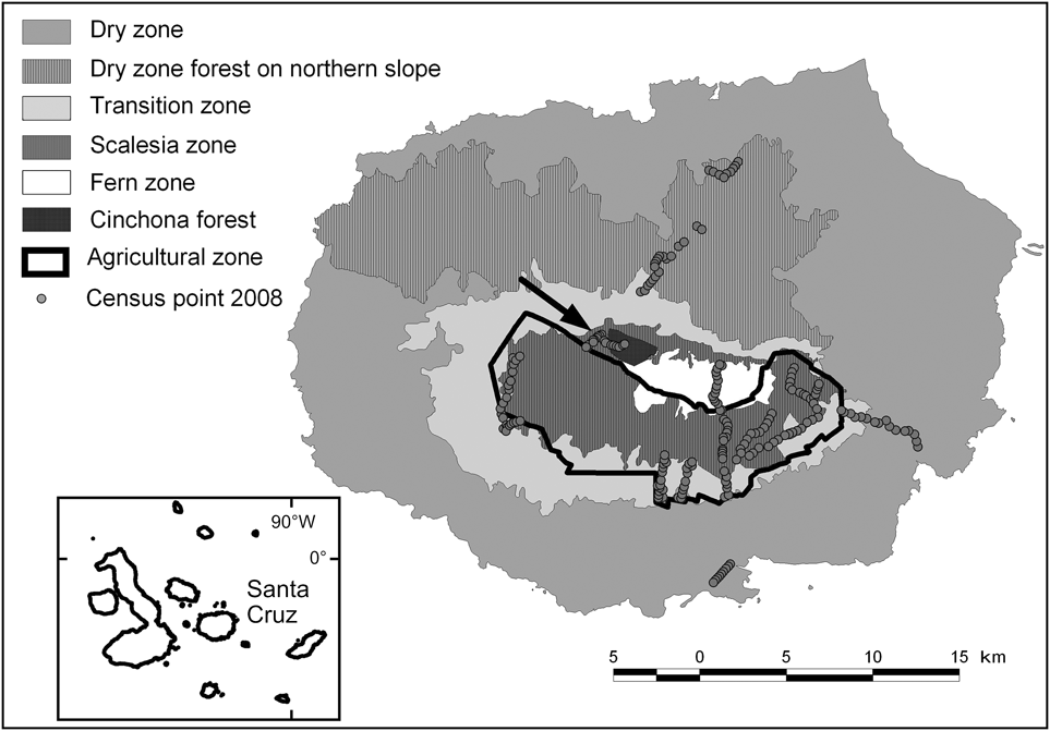 Fig. 1 The extent and location of the vegetation zones on Santa Cruz Island, based on data from Huttel (Reference Huttel, Lawesson, Hamann, Rogers, Reck and Ochoa1990), and the locations of the 233 survey points (Table 1) used in 2008. The inset indicates the location of Santa Cruz in the Galápagos archipelago.
