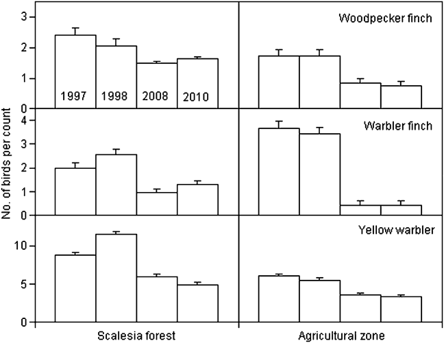 Fig. 2 Mean (± SE) number of birds per point count for woodpecker and warbler finches and yellow warbler in 1997, 1998, 2008 and 2010 in the Scalesia forest and agricultural zones of Santa Cruz Island (Fig. 1). Note the different y-axis scales. These three species showed the strongest declines in these zones.