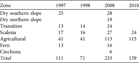 A snapshot approach was used. At the beginning we counted all singing birds as rapidly as possible; then, during the remaining minutes, we counted any additional birds in the context of the position and behaviour of the individuals already registered. Using this approach we decreased the risk of counting the same individuals twice (e.g. while moving around) and increased the probability of recognizing new birds that were silent during the initial phase. We avoided counting birds that were obviously not present at the point initially, such as individuals moving into the area during the 5-minute counting period. Points were generally counted once per year as it was assumed that the census period covered the main phase of singing activity. In 1997 and 1998 some points were counted twice; in this case the count with the highest bird numbers was used. Points covered all vegetation zones and altitudes on Santa Cruz (Table 1). Because of the difficulties of accessing some parts of the island points could not be located randomly but were placed along existing paths and small roads (we avoided counting along busy and wide roads). Points were spaced at least 500 m apart in all habitats except in the Scalesia zone, where smaller distances had to be used. Coverage of vegetation zones was uneven between years, with an emphasis on the agricultural and Scalesia zones. In 2008 we added additional survey points in the dry northern slope and Cinchona zones (Table 1). We repeated point counts in the agricultural and Scalesia zones in 2010 to test the validity of the results from 2008.