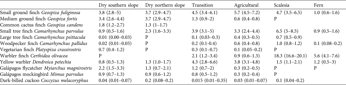 Table 2 Estimates of the density of singing males per ha (with 95% confidence intervals in parentheses) of 12 bird species in 2008, including eight species of Darwin’s finches, in the seven vegetation zones on Santa Cruz Island (Fig. 1). P (present) indicates a species was recorded in low numbers; empty fields indicate the species was not detected. Confidence intervals were calculated with Distance, using bootstrapping methods.