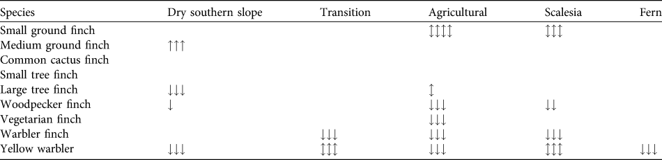 Table 3 Trends in the relative abundance of eight species of Darwin’s finches and the yellow warbler across five of the seven vegetation zones (trends cannot be examined for the dry northern and Cinchona zones as there are data for only 1 year) on Santa Cruz Island (Fig. 1). Black shading indicates that the species was not observed, grey that the species occurred irregularly (Table 2). We tested for significant differences in abundance across years and zones with an ANOVA using Bonferroni post-hoc corrections. Arrows indicate significance at P < 0.05 (one arrow), < 0.01 (two) and < 0.001 (three) and direction of change; arrows in both directions indicate fluctuating significance between years. Empty fields indicate no significant change between years.