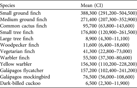 Table 4 Estimates of the mean total population of singing males (with confidence intervals in parentheses) of 12 bird species in 2008, including eight species of Darwin’s finches, on Santa Cruz Island (Fig. 1). Values calculated with Distance for each vegetation zone were multiplied by the respective area and then summed for the entire island. Values are rounded to the nearest 100.
