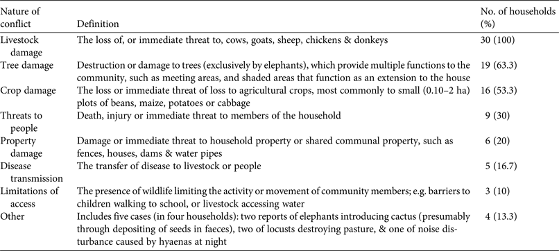 Human–wildlife conflict, although a contested term (Redpath et al., Reference Redpath, Bhatia and Young2015), denotes damage to property, limb or life, or disturbance of the rights of individuals or groups that are directly attributable to the actions or presence of wild animals. Accordingly, we asked respondents to describe their experiences and identify what they perceived as conflict attributable to the presence of wildlife. In many cases this involved events in which losses were not quantifiable but where the threat of loss or damage was perceived as immediate and significant, and some disturbance of rights resulted; for example, time and effort lost to protecting assets from damage was counted as a cost of conflict, even where no material damage resulted. The array of damages and disturbances reported were grouped into categories of conflict (Table 2). The term ‘point of conflict’ is used to denote each cell in an interaction matrix listing all reported species against all reported categories of conflict (Table 3).