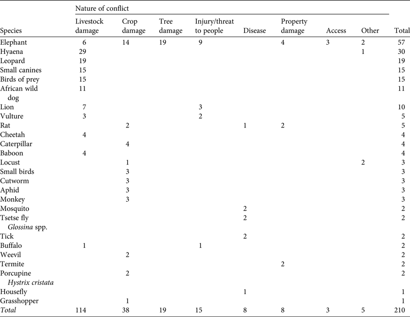 In a few cases where vernacular language used by respondents prevented unambiguous identification to species level, allied or similar species were aggregated into groups (e.g. birds that caused livestock damage (‘hawk’ and ‘eagle’) were grouped as ‘birds of prey’; birds that fed on crops (‘hornbill’, ‘finch’ and ‘bird’) were grouped as ‘small birds’; jackals and foxes were grouped as ‘small canines’, and spotted and striped hyaenas, Crocuta crocuta and Hyaena hyaena, respectively, were recorded as ‘hyaena’; vultures, rats and insect groups were recorded in the respondents’ language. For these groups the Latin names of species are not used in the discussion.