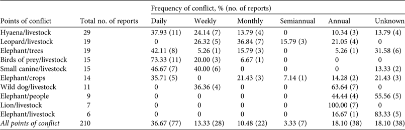 Most households reported experiencing some form of conflict every day (76.6%), 13.3% reported experiencing it weekly and 10% monthly; no households reported that they did not experience any conflict. The 210 reported points of conflict demonstrate the range of perceptions and experiences (Table 4): 36.66% of conflicts were reported to occur on a daily basis, 13.33% weekly, 10.48% monthly, 3.33% semiannually, and 18.10% annually; 18.10% were of unspecified frequency. Over 60% of households reported experiencing threats from hyaenas daily or weekly. Damage by birds, although reported by fewer households overall, was reported as occurring frequently by those affected. Damage to livestock by canines is also notable for its consistency and frequency, with > 85% of households affected reporting daily or weekly events. Depredation of livestock by lions, and threats to people by elephants, although often discussed in the literature, were reported to occur infrequently, and no deaths or injuries to people were reported.