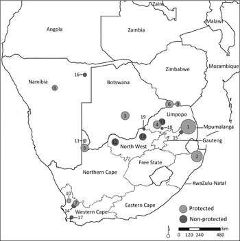 The leopard Panthera pardus is a large generalist felid with a wide geographical distribution in Africa and tropical Asia (Henschel et al., Reference Henschel, Hunter, Breitenmoser, Purchase, Packer and Khorozyan2008). In South Africa leopards are well adapted to inhabit human-dominated landscapes and are frequently found outside protected areas (Swanepoel et al., Reference Swanepoel, Lindsey, Somers, van Hoven and Dalerum2013). Even though non-protected areas are important for leopard conservation in South Africa (Swanepoel et al., Reference Swanepoel, Lindsey, Somers, van Hoven and Dalerum2013), leopards are often killed during conflict with farmers (Balme et al., Reference Balme, Slotow and Hunter2009). Furthermore, leopards are prized specimens in the trophy hunting industry and a large number are poached for their skin (Balme, Reference Balme2009). As hunting and other human-induced mortality can be additive rather than compensatory to natural mortality (Krebs et al., Reference Krebs, Lofroth, Copeland, Banci, Cooley and Golden2004), it can have negative effects on long-term population viability (Creel & Rotella, Reference Creel and Rotella2010). Therefore, to adequately address the conservation needs of leopards it is also important to identify the primary causes of mortality. Furthermore, survival rates of carnivores in non-protected areas are generally low, which may impede conservation programmes (Krebs et al., Reference Krebs, Lofroth, Copeland, Banci, Cooley and Golden2004; Andrén et al., Reference Andrén, Linnell, Liberg, Andersen, Danell and Karlsson2006). A better understanding of rates of survival and causes of mortality in non-protected and protected areas is therefore crucial for our ability to develop sustainable management strategies for leopards in southern Africa.