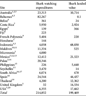 Table 1 Locations (by country, in alphabetical order) with available data on annual shark watching expenditure (for countries with > 1 site, only available data are included here; i.e. no estimates are included). Shark landed values are total for the country using taxon-specific landings and price (based on data from Sumaila et al., Reference Sumaila, Marsden, Watson and Pauly2007; data not available for Fiji, Honduras, Micronesia and Palau). All values are per year, in USD × 1,000 (at the 2011 rate).