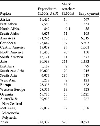 Table 2 Estimated annual economic benefits of shark watching by region (FAO, 2011). Expenditures are in USD (at the 2011 rate); employment is in full-time equivalents.