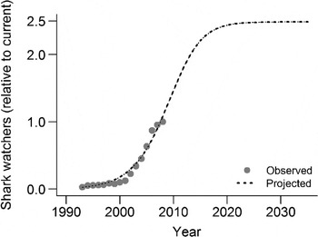 The classic tourism growth model follows a logistic pattern with discrete stages of establishment, development, consolidation and maturity (Butler, Reference Butler1980) and has been extensively documented and tested against real data (Cole, Reference Cole2009). To provide an estimate of potential future industry growth, we fitted a logistic model to available trend data to obtain the maximum (asymptote) value relative to current visitor numbers. Although future growth is expected for tourism in general (UN World Tourism Organization, 2011) we did not factor in the addition of new shark watching sites and thus our projection is conservative.