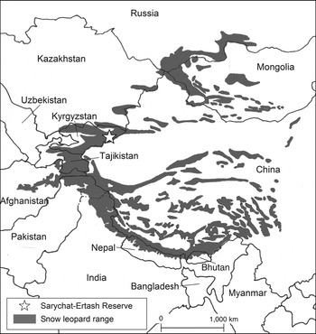Fig. 1 Snow leopard Panthera uncia range, adapted from Fox (Reference Fox, Fox and Jizeng1994), and the location of the study area, Sarychat-Ertash Reserve, in Kyrgyzstan.
