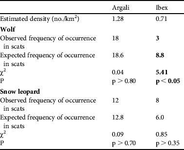 The crude densities of the two main prey species were estimated to be 0.67 and 1.79 individuals km−2 for ibex and argali, respectively. Observed and expected distributions of these prey species in the scats are shown in Table 1. The observed frequencies of argali were as expected in both snow leopard and wolf. In wolf, ibex occurred less frequently than expected, whereas in snow leopard ibex occurred according to their availability in the Reserve.