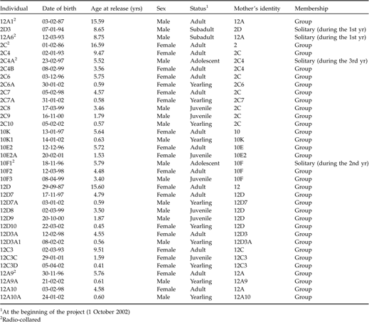 Table 1 Details of mandrills selected for the rehabilitation project, indicating their age at release and matrilineal origins.