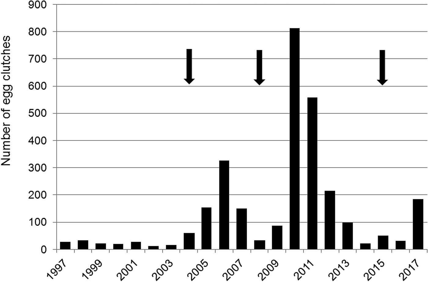 Fig. 2 Yearly variation in the number of egg clutches deposited by Rana latastei at the Site of Community Interest ‘Riserva di Monticchie’ in northern Italy. Arrows indicate the years when the canal network was dredged to increase water availability.