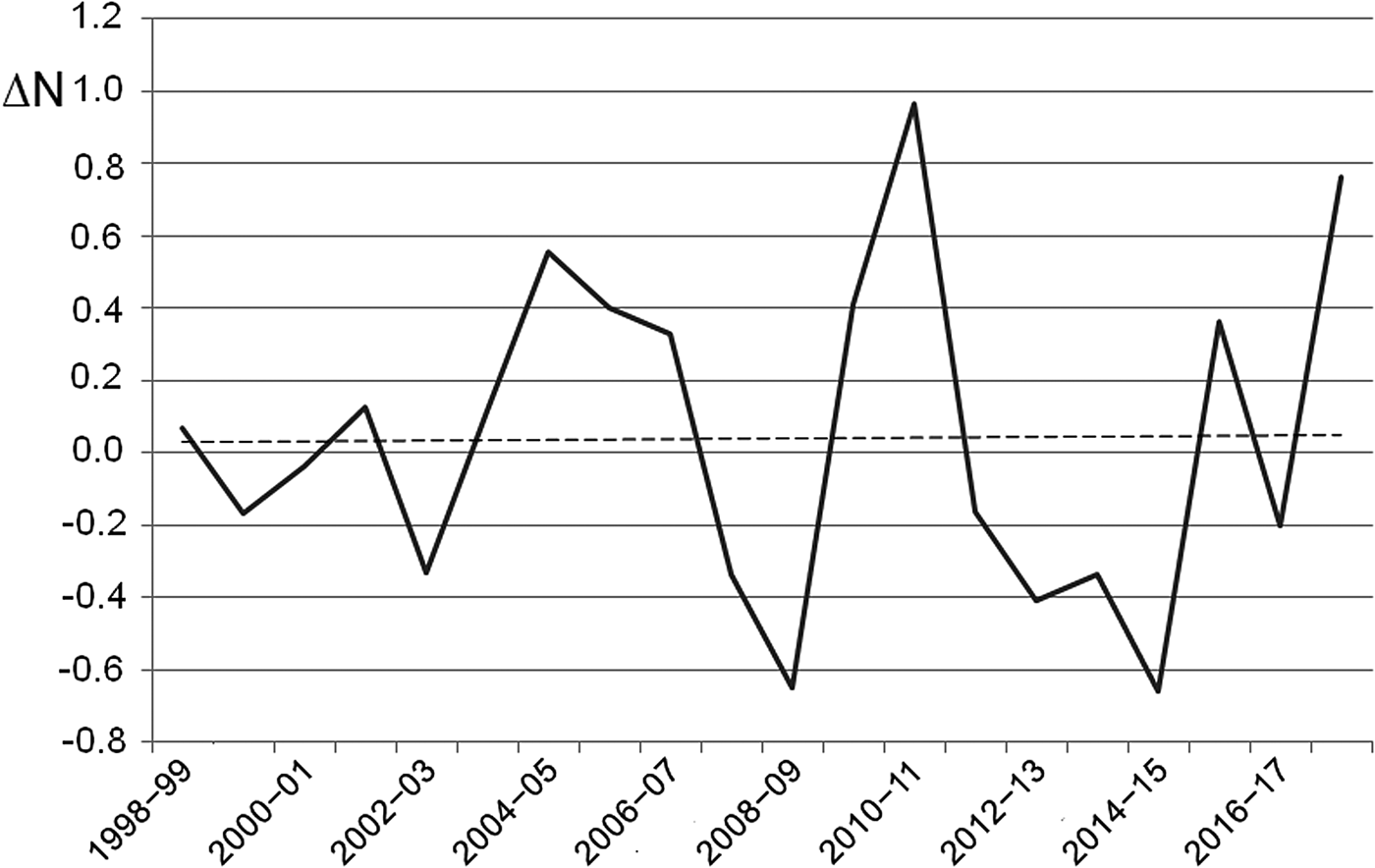 Fig. 3 Rate of yearly change (ΔN) in R. latastei egg clutch numbers at the Site of Community Interest ‘Riserva di Monticchie’ in northern Italy. The dashed line shows the slightly positive overall trend.
