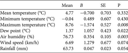Table 1 Tests for potential trends in climatic variables at Piacenza and Sant'Angelo Lodigiano in February 1997–2017, with mean values and coefficients (b) and their standard errors (SE) from regressions of the variables against year. Significant trends (t-tests P < 0.01) are shown in italics.
