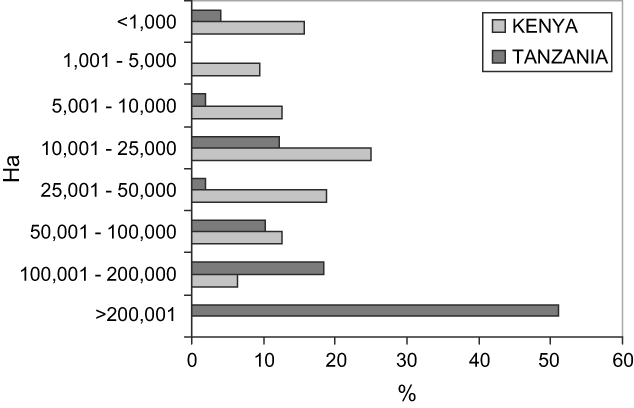 Fig. 1 The sizes of individual private protected areas in Kenya and Tanzania.