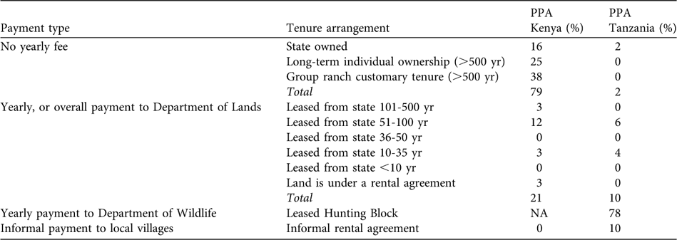 Table 2 Payment type and tenure arrangements for private protected areas (PPA) in Kenya and Tanzania, with percentage in each category.