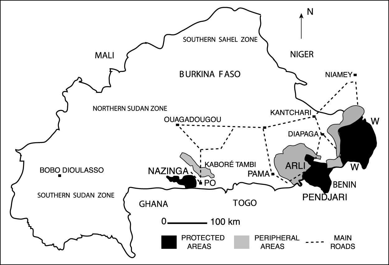 The area surveyed was in south-east Burkina Faso from Ouagadougou south to the borders of Ghana and Benin and east to Niger (Fig. 1). The protected areas it encompassed were: (1) the Nazinga game ranch, a 93,000 ha hunting reserve; (2) the 76,000 ha Arli National Park along the Benin border and the contiguous 275,000 ha Pendjari National Park (referred to here as Arli-Pendjari); (3) the 957,000 ha W National Park across the borders of Burkina Faso, Niger and Benin. The surrounding, little inhabited buffer zones included, respectively: (1) the heavily poached 155,000 ha Kaboré Tambi National Park, north of Nazinga; (2) the 600,000 ha Singou, Arli, Pama and Madjoari hunting areas, north and west of Arli; (3) the >200,000 ha hunting areas north (Tapoa-Djerma) and south-west (Kondio-Kourtiagou) of W National Park. In Benin only the Pendjari National Park, and not the >300,000 ha hunting areas south of this and W National Parks, were surveyed. Latitudinally, the study area ranged between 11°N (Pendjari) and 13°N (south of Niamey, Niger), i.e. all within the Sudan vegetation zone.