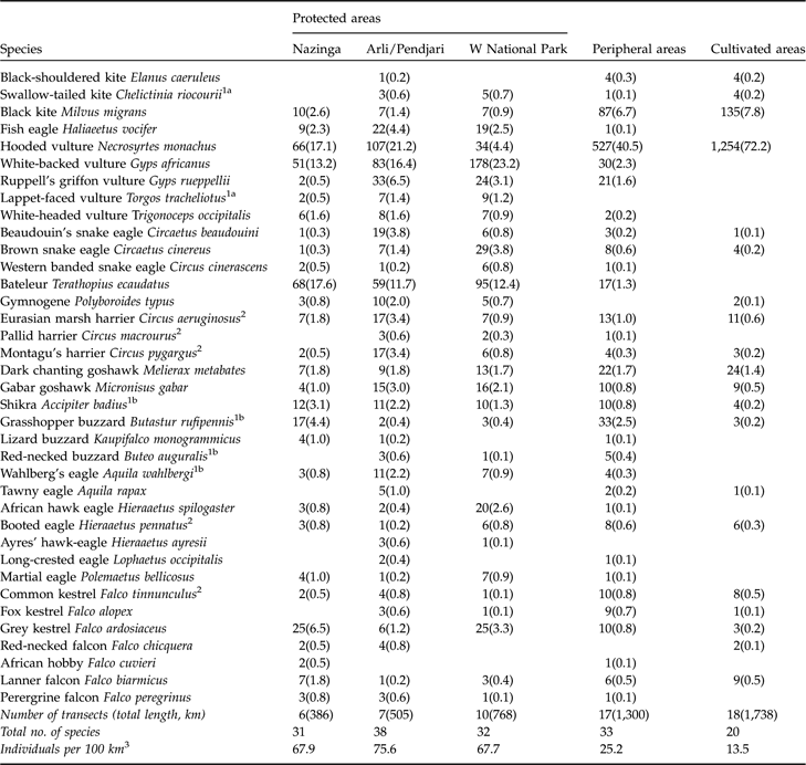 Table 1 Total number of individual raptors recorded in transect counts (with mean number per 100 km of driven transect in parentheses) in the three protected areas surveyed and in the peripheral and cultivated areas (Fig. 1).