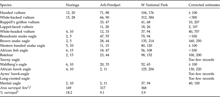 Almost nothing is known about the demography of any large raptor species in West Africa. Assessing their viability therefore relies solely on their distributions and population sizes but because only 6.2% of all protected and peripheral areas were surveyed the population estimates are only tentative. However, the small, more thoroughly surveyed Nazinga ranch provided a useful reference against which to check the reliability of the population estimates, and the lower estimates of this study were consistent with the comprehensive work of Weesie & Belemsobgo (Reference Weesie and Belemsobgo1997).