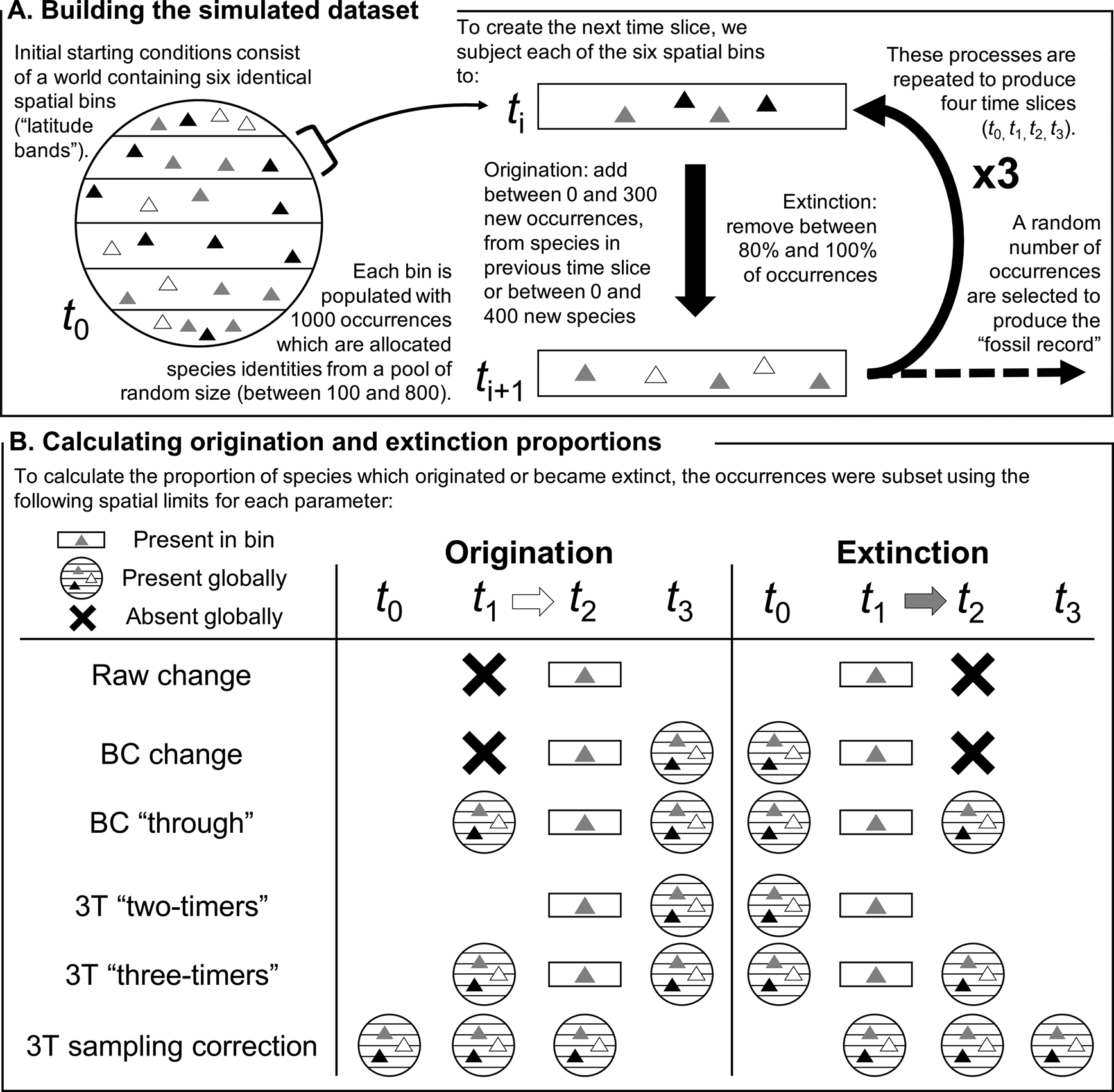 Figure 1. Schematic explaining (A) the construction of the simulated dataset and (B) implementation of the different methods of estimating origination and extinction proportions in a specific spatial bin. The triangles represent occurrences, while their shades indicate the species they belong to. “BC” refers to the “boundary-crosser” method (Foote Reference Foote1999) and “3T” refers to the “three-timer” method (Alroy Reference Alroy2008). The 3T sampling correction is calculated using an equation that evaluates sampling completeness across the global dataset.