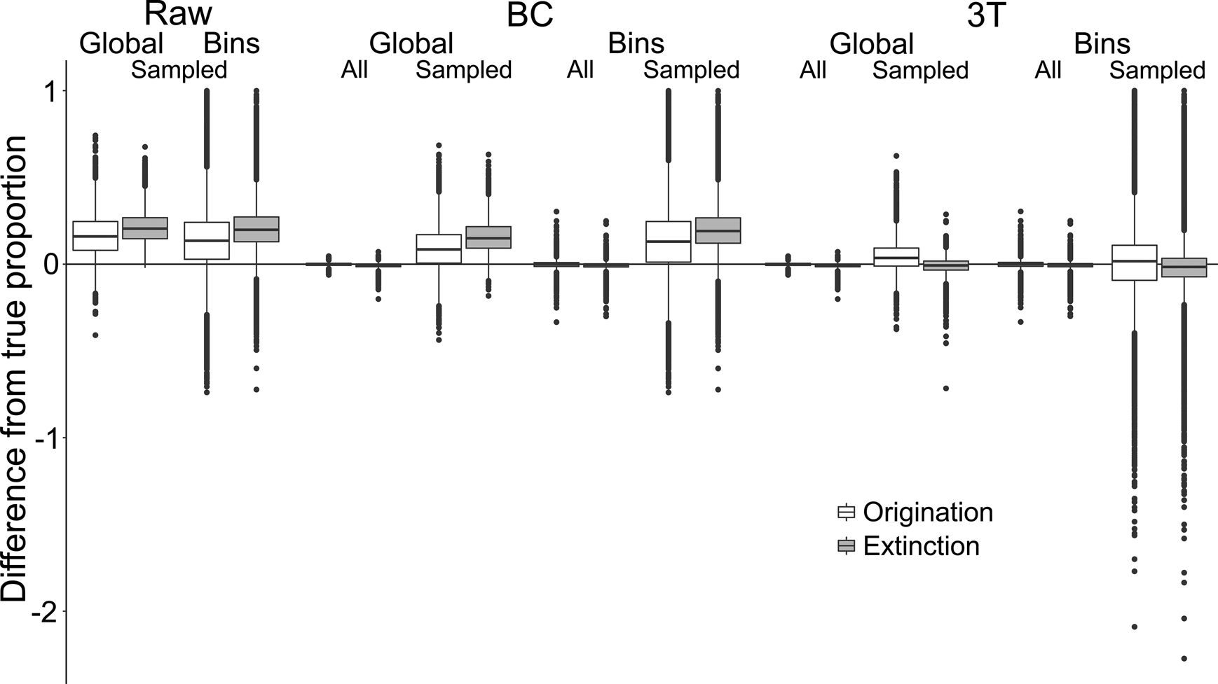 Figure 3. Differences between “true” and estimated proportional origination and extinction. Proportions were compared between global and individual spatial bin scales. “BC” refers to the “boundary-crosser” method (Foote Reference Foote1999) and “3T” refers to the “three-timer” method (Alroy Reference Alroy2008).