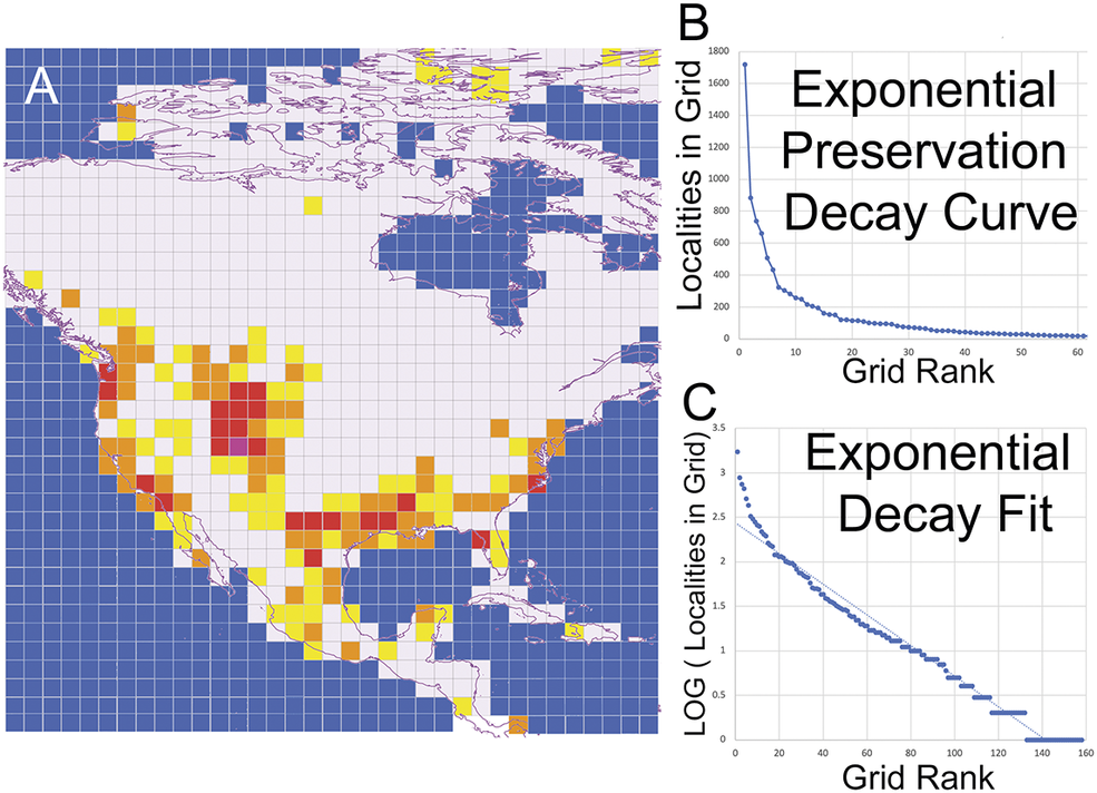 Figure 3. A, Map of terrestrial Eocene fossil locality density and modeled fossil preservation spatial decay curves used to calculate the expected occurrence numbers for each fossil group. Grids with more than 1000 localities are shaded purple; between 999 and 100, shaded red; between 99 and 10, shaded orange; 9 to 1 shaded yellow; and white represents no known fossil terrestrial Eocene localities within grid. B, Exponential preservation decay curve from spatial distribution of all fossil localities. C, Log fit calculation of preservation decay curve, where a can be adjusted to match the curve for predicted the model of fossil group occurrences in each grid region.