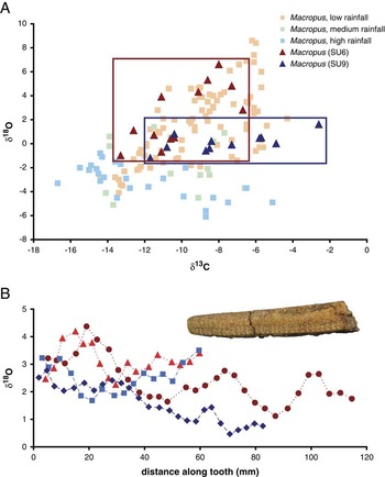 SU9 was formed under less arid conditions than SU6, as inferred from lower δ18O mean values in Macropus (p=0.024, Mann-Whitney U-test; Fig. 1A, Supplementary Tables 1 and 2). Stable oxygen isotope values for SU9 are also significantly greater than those for extant kangaroos from high rainfall regimes, but are indistinguishable from kangaroos found in either medium or low rainfall regimes (Dunn’s procedure; Supplementary Tables 3 and 4).