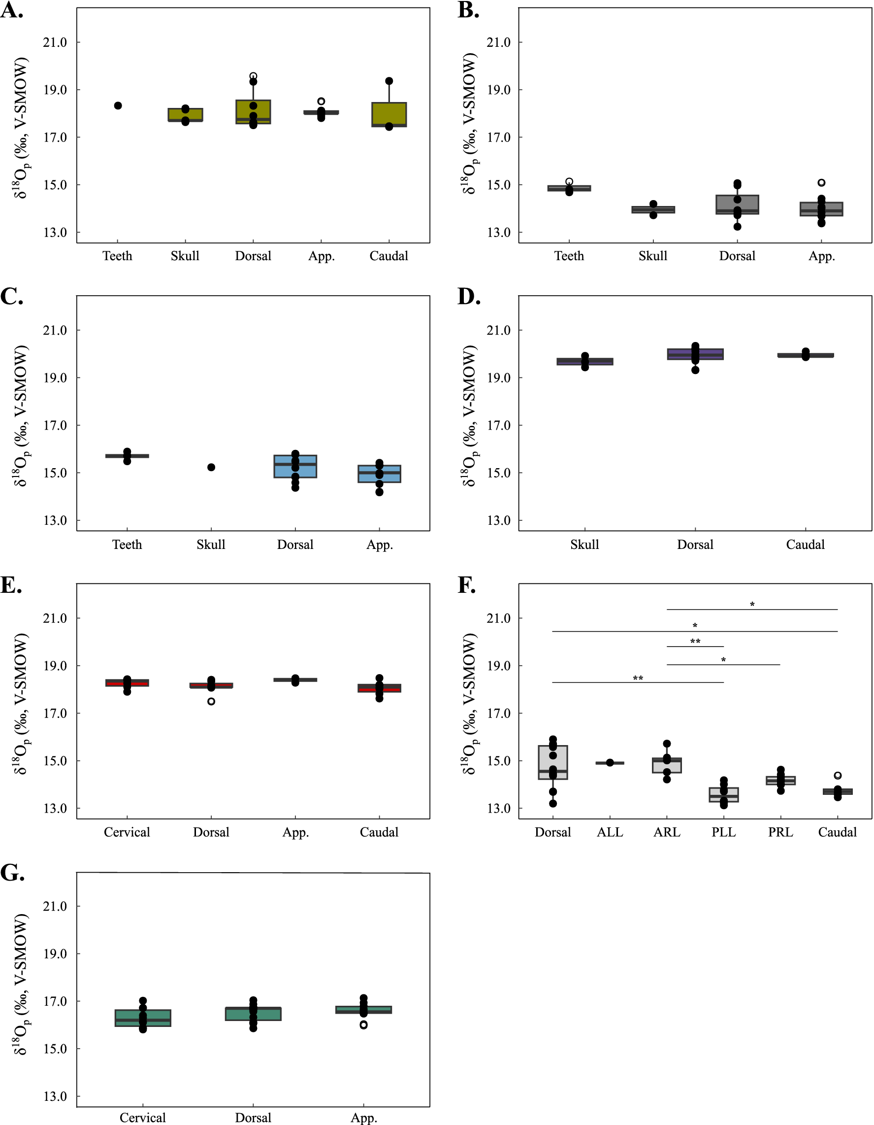 Figure 4. Box plots showing the δ18Op value distribution of bones sets for the specimens of Ichthyosauria (A, Ichthyosauria indet.; B, Keilhauia sp.; C, Palvennia hoybergeti), Metriorhynchus aff. superciliosus (D) and Plesiosauria (E, Elasmosauridae indet.; F, Colymbosaurus svalbardensis; and G, Cryptoclididae indet.). Asterisks indicate the significance of the observed differences between pair of groups: *p-value < 0.05; **p-value < 0.01; ***p-value < 0.001. Outliers are plotted as white circles. The horizontal bars in the boxes correspond to the medians and the whiskers to the minimum and maximum values. The average analytical error for each bone analyzed is on the order of 0.3‰. Abbreviations: App., Appendicular region; ALL, anterior left limb; ARL, anterior right limb; PLL, posterior left limb; PRL, posterior right limb.