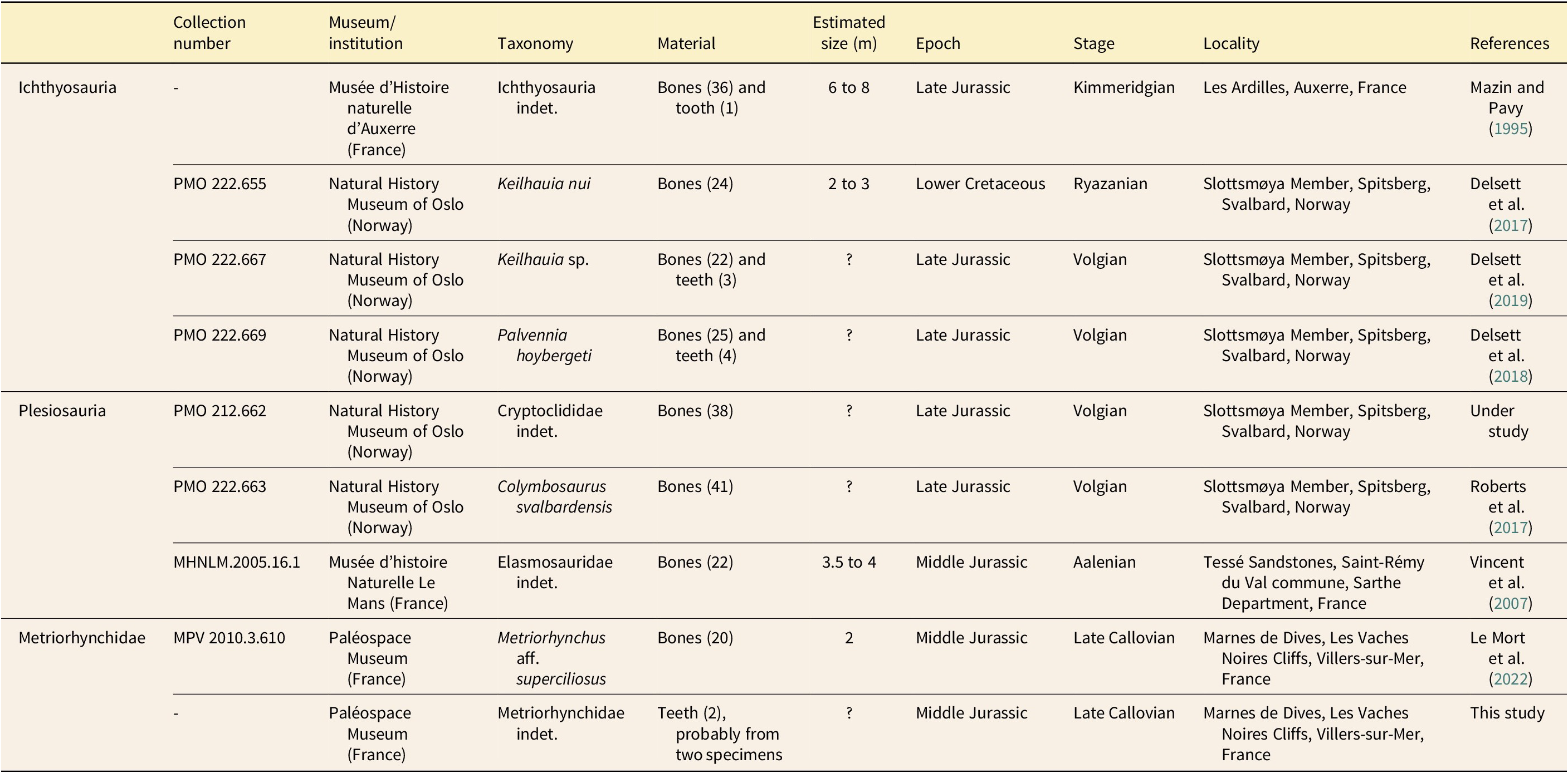 Table 1. Summary of information from Ichthyosauria, Plesiosauria, and Metriorhynchidae specimens sampled.