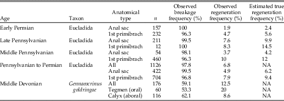 The frequency of regeneration in the Devonian Gennaeocrinus sample was 9% for the straight calycal spines and 20% for the branching tegmenal spines. However, the unusual branching form of the tegmenal spines makes it impossible to perform the adjustment for postmortem breakage, and in many specimens the evidence for regeneration was ambiguous, so this estimate should be regarded as less reliable than the values for the late Paleozoic sample.