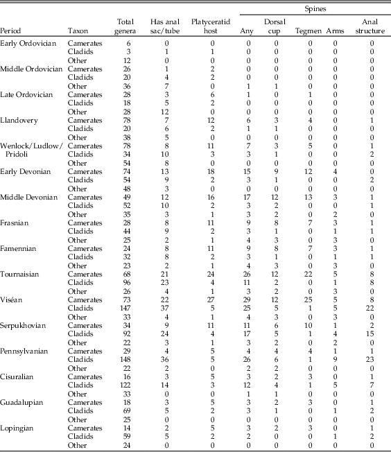 Platyceratid occurrence was tabulated from the work of Kluessendorf (Reference Kluessendorf1983) for Silurian and from illustrations in Goldring (Reference Goldring1923) for Devonian crinoids, from previous work by Gahn and Baumiller (Reference Gahn and Baumiller2006), and from observations (by C.E.B.) of specimens in the U.S. National Museum, the American Museum of Natural History, the University of Michigan, and the large collections of Dr. George C. McIntosh (Rochester Museum and Science Center).