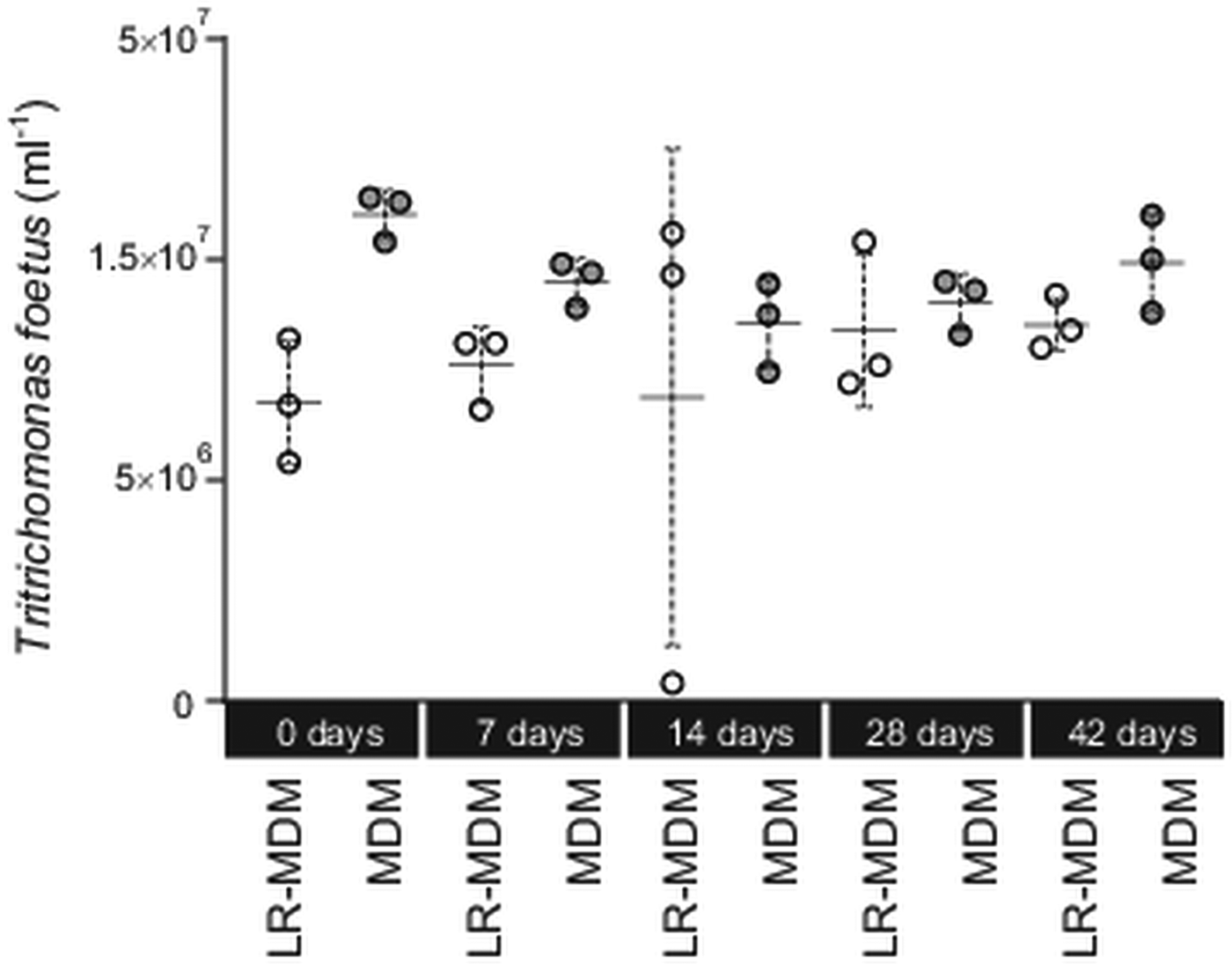 Fig. 1. Tritrichomonas foetus culture in lyophilized reconstituted MDM and liquid MDM. Prior to inoculation with T. foetus the media were stored for up to 42 days. Yield of T. foetus was recorded 5 days post inoculation for both lyophilized reconstituted MDM (LR-MDM) and liquid MDM (MDM). The scatter graph represents the triplicates inoculated for each storage time, and each form of media, with the standard deviation and mean represented for each group.