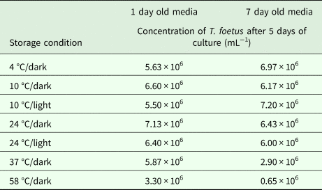The use of MDM for culture of T. foetus was implemented in the late 1950s (Levine, Reference Levine1973). Early methods supplement the media with sheep or horse serum and state the medium should not be utilized past 10–14 days of refrigeration due to loss of viability (Levine, Reference Levine1973; Jensen, Reference Jensen1983). Our study demonstrates the capacity of MDM supplemented with 5% FBS, which was consistently able to support T. foetus culture up to 42 days when stored at 4 °C. FBS is considered as superior to other forms of serum (Marco-Jimenez et al., Reference Marco-Jimenez, Garzon, Penaranda, Perez, Viudes-de-Castro, Vicente, Jover and Asturiano2006; Nims and Harbell, Reference Nims and Harbell2017). The use of FBS in cell culture lines decreases the doubling time of cells and significantly increases the number of possible passages when compared to horse serum (Nims and Harbell, Reference Nims and Harbell2017). The addition of 5% FBS to liquid MDM is beneficial and enables storage of media for up to 6 weeks for T. foetus culture. Fetal calf serum is also recommended for T. foetus transport (Buller and Corney, Reference Buller and Corney2013).