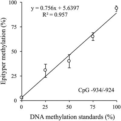 Figure 1 Linear association between unmethylated (0%), 35, 50, 75, and 100% methylated samples for individual and mean values across target region (cytosine phosphodiester guanine [CpG] -934/-924) in the EpiTYPER assay. Each standard was run in triplicate. The error bars are indicative of standard error.