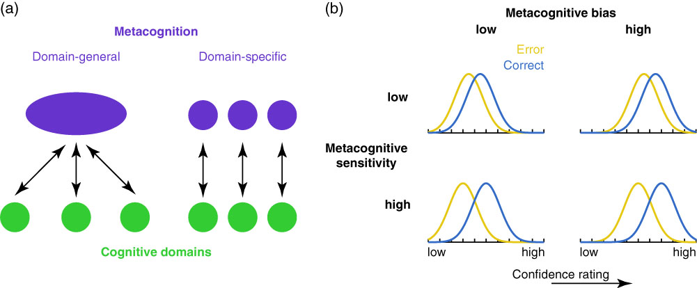 Figure 1 (a) It remains debated whether metacognition operates as a domain-general resource applied over cognitive domains (left) and/or whether metacognition itself relies on domain-specific components that operate over corresponding cognitive domains. (b) Metacognitive bias and metacognitive sensitivity are two independent aspects of metacognition. Metacognitive bias corresponds to an overall tendency to rate confidence higher (right panels) or lower (left panels), irrespective of performance. Metacognitive sensitivity quantifies the extent to which correct and error trials can be discriminated (adapted from Fleming & Lau, Reference Fleming and Lau2014).