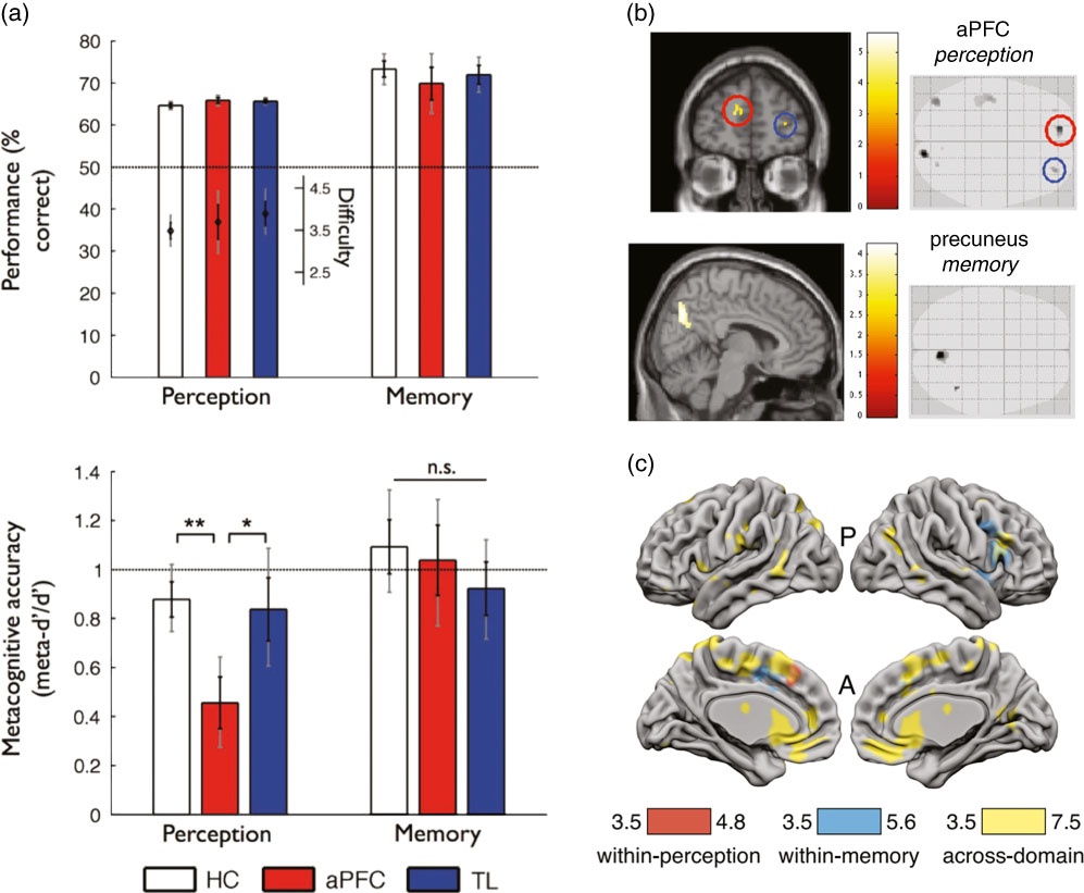 Figure 5 Different methodologies for quantifying brain structure and function shed light on the underpinnings of metacognition across domains. (a) Human subjects with anterior prefrontal cortex lesions (aPFC) were found to have reduced metacognitive efficiency on a perceptual but not a memory task (lower panel), compared with temporal lobe lesion patients (TL) and healthy controls (HC), despite matched performance and task difficulty (upper panel; reproduced from Fleming, Ryu, Golfinos, & Blackmon, Reference Fleming, Ryu, Golfinos and Blackmon2014). (b) Individual differences in metacognitive efficiency for perception were found to correlate with aPFC grey matter volume, whereas individual differences in metacognitive efficiency for memory were found to correlate with medial parietal cortex (precuneus) grey matter volume. Structural variation in each of these regions was in turn positively correlated across participants, translating into a behavioral correlation of metacognitive efficiencies between domains (reproduced from McCurdy et al., Reference McCurdy, Maniscalco, Metcalfe, Liu, de Lange and Lau2013). (c) Multivariate analyses of human neuroimaging data revealed widespread classification of confidence level in dorsal anterior cingulate cortex/pre-supplementary motor area (dACC/pre-SMA), ventromedial prefrontal cortex (vmPFC), and striatum that generalized across domains (yellow). In contrast, domain-specific patterns of confidence-related activity were identified in right lateral aPFC (region of interest analysis not shown; reproduced from Morales, Lau, & Fleming, Reference Morales, Lau and Fleming2018).