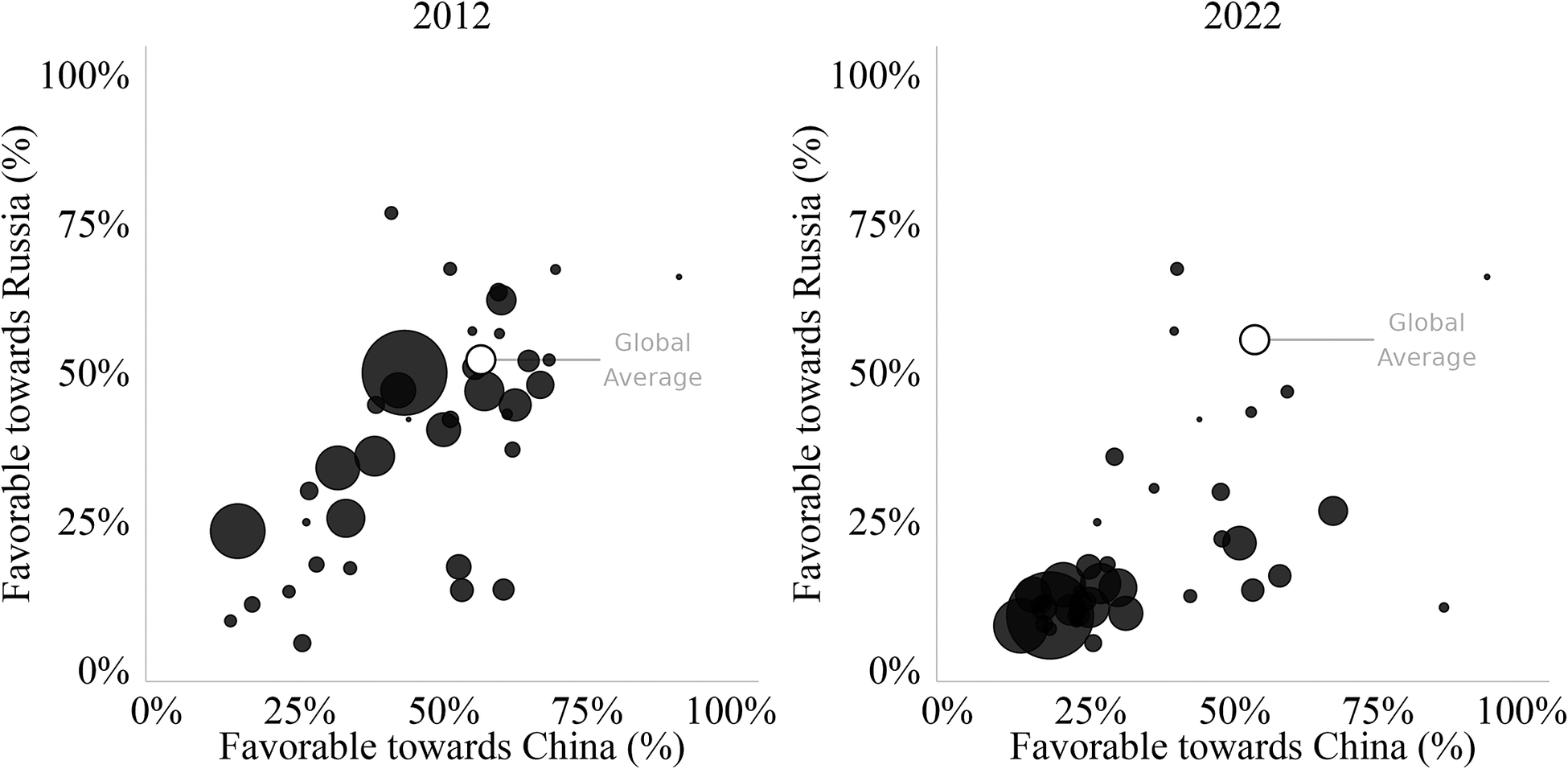 Notes: The distribution of public opinion toward Russia and China among liberal democracies in 2012 and 2022, shown with the global population-weighted average (for all countries, including nondemocracies) for each year. Point size area represents country population. Liberal democracies (38 countries) are countries with a V-Dem liberal democracy score higher than 0.6 in the most recent year of the data. Source data aggregated from the Pew Global Attitudes project, Latinobarometer, Afrobarometer, the Arab Barometer, Latana, Zogby, the International Republican Institute, Gallup, the Central Asia Barometer, and individual country polls (for a summary of sources and items, see Foa et al. Reference Foa, Mollat, Isha, Romero-Vidal, Evans and Klassen2022). On a population-weighted basis, global public opinion toward Russia and China is little changed, with little net shift of attitudes in countries such as India, Pakistan, Indonesia, or Nigeria. By contrast, the publics of western liberal democracies have clustered toward negative evaluations.
