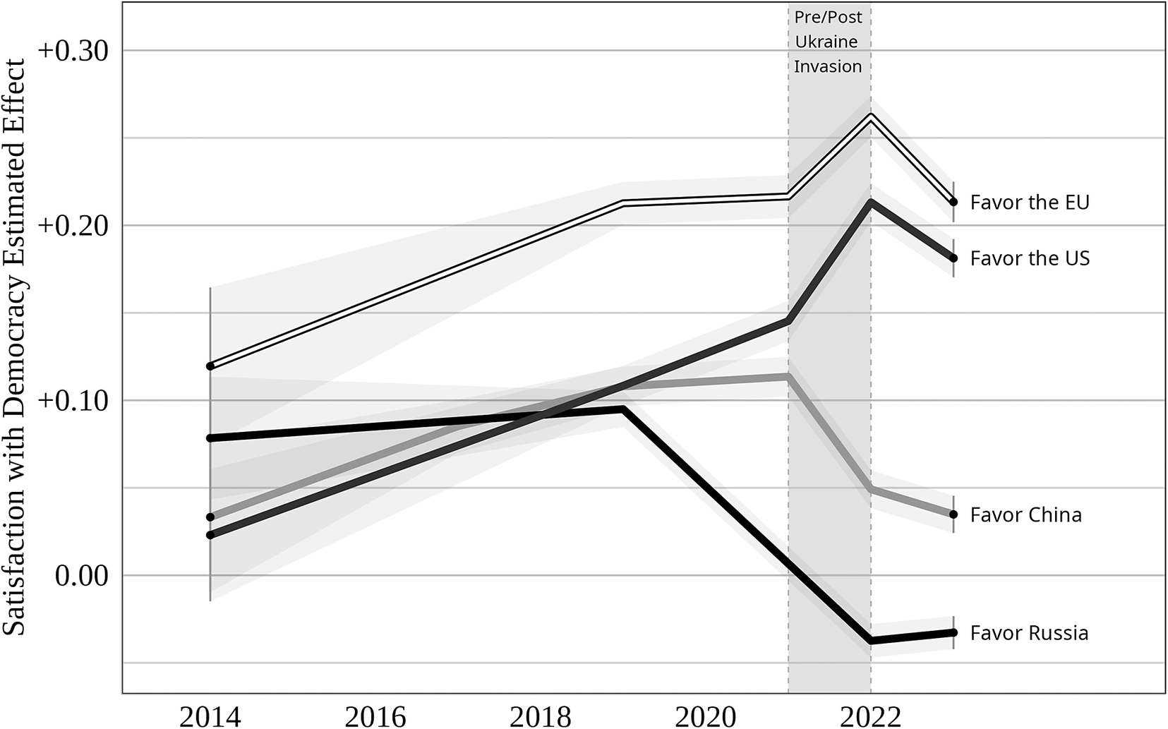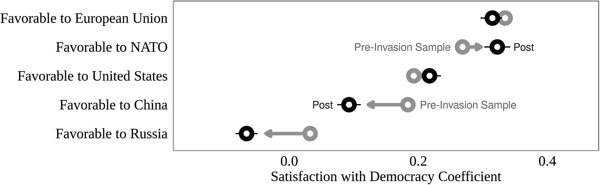 Notes: Change in coefficient magnitude for the effect of democratic satisfaction on favorability toward each international actor before the invasion (in gray) and post-invasion (in black). 90% coefficient confidence intervals indicated by strikethrough lines.