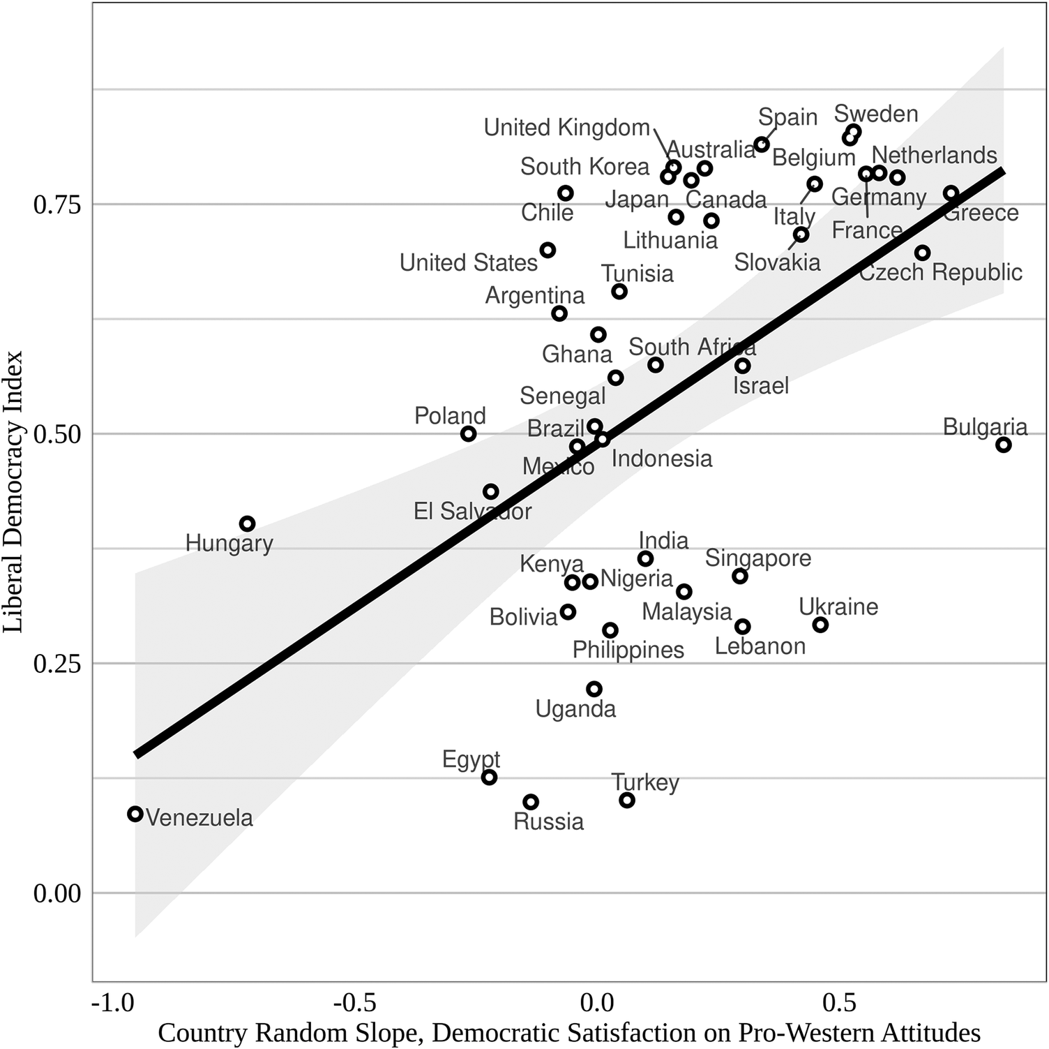 Notes: Multilevel model random slopes for the association between democratic legitimacy (satisfaction with democracy) and pro-western views by country, plotted by country degree of democracy (V-Dem index of liberal democracy).