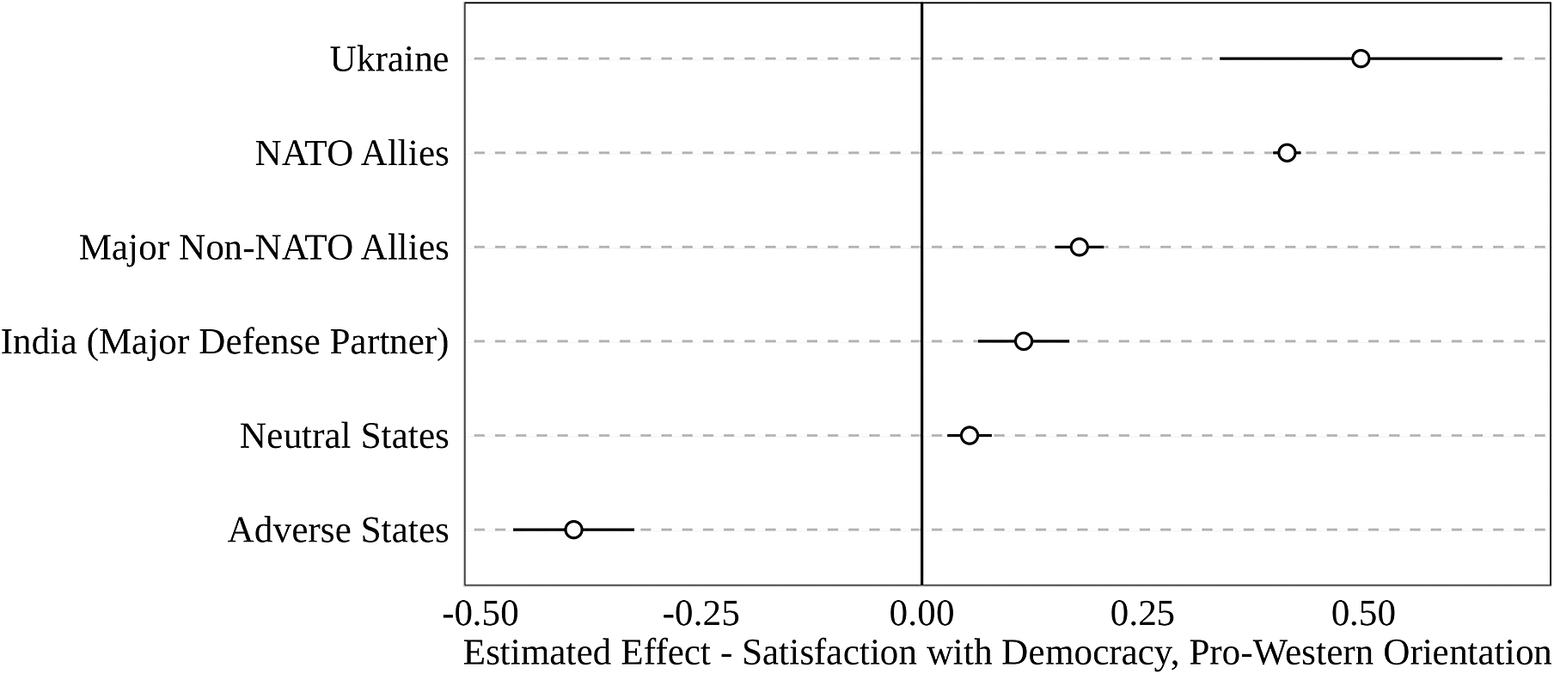Broadly speaking, we find that the closer a country’s security relationship is to the United States, the stronger the tie connecting domestic democratic legitimacy to support for western powers. This association is clearest in the data from Ukraine, whose military funding and rearmament depend heavily on western aid and logistical support. Ukraine is then followed by the member states of NATO. Beyond the NATO alliance, we find that the association is stronger among non-NATO US allies than in countries lacking an explicit security partnership with the United States. This likely reflects the central role played by the United States in providing military aid and direct security protection to non-NATO countries such as Israel, South Korea, and Japan, as well as the historical role that US society has played in fostering the democratic development of partner countries. In contrast to the realist view that international allegiances reflect strictly “national” sovereignty goals that function independently of domestic political ideals, these results suggest an important role for “regime” sovereignty. We have no a priori reason to believe that respondents who are satisfied with democratic functioning should differ in valuing the guarantors of national sovereignty, except insofar as this specifically links with regime security; that is, the stability of the democratic institutions that they value.