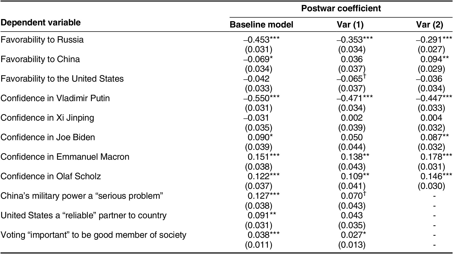 Notes: Baseline model: country-fixed effects (CFEs) only. Var (1): CFEs plus demographic controls (age, age squared, sex, income, education). Var (2): CFEs, demographic controls and respondent average favorability/confidence.